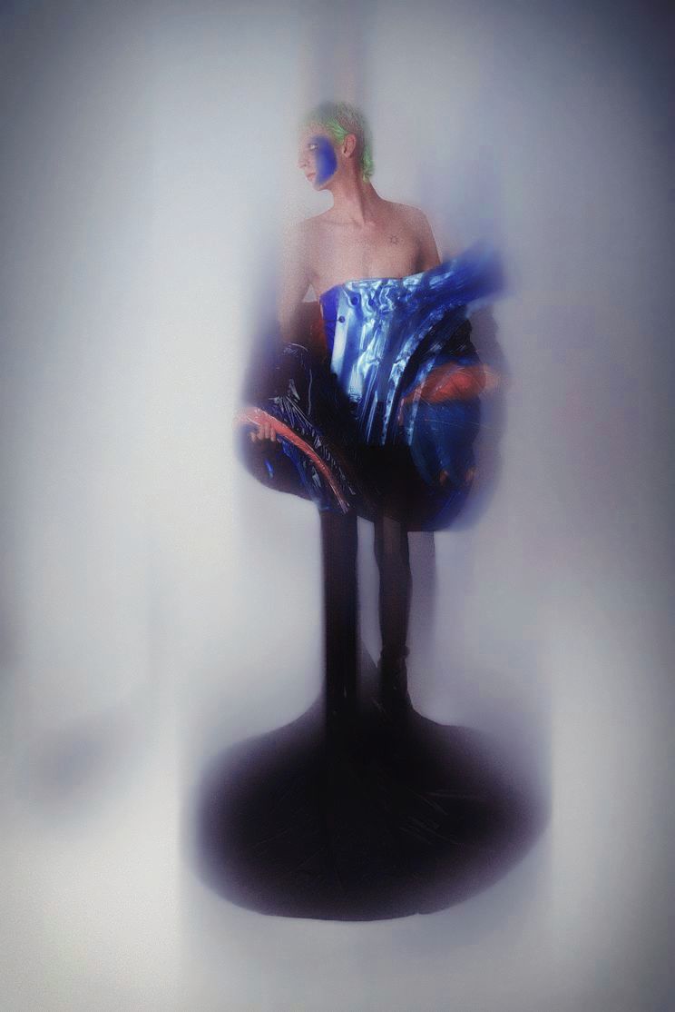 THIS COLLECTION FORMS A DIALOGUE BETWEEN OUR GARMENTS AND OURSELVES, HOW THEY ACT BOTH AS A ‘PROJECTION OF THE SELF’ AND A ‘PROTECTIVE SHELL’. INFLUENCED BY THE IMAGES OF CECIL BEATON’S GLITTERING PORTRAITS OF THE BRIGHT YOUNG THINGS IN THE 1920S, I MERGED THESE WITH THOSE OF JOHN CHAMBERLAIN’S GLEAMING METAL SCULPTURES MADE FROM USED CAR PARTS TO CONTRAST TRADITIONAL SHINE SURFACES SUCH AS SILKS AND SATINS WITH MORE INDUSTRIAL GLEAMING SURFACES. THIS HELPED ME CREATE THE IDEA OF A GARMENT OR PERSON BEING ENCASED, ALMOST AS IF THEY HAD MERGED WITH THE GLISTENING CELLOPHANE BACKGROUND OF A PHOTOGRAPH, FORMING A TENSION BETWEEN HARD AND SHELL-LIKE SURFACES.